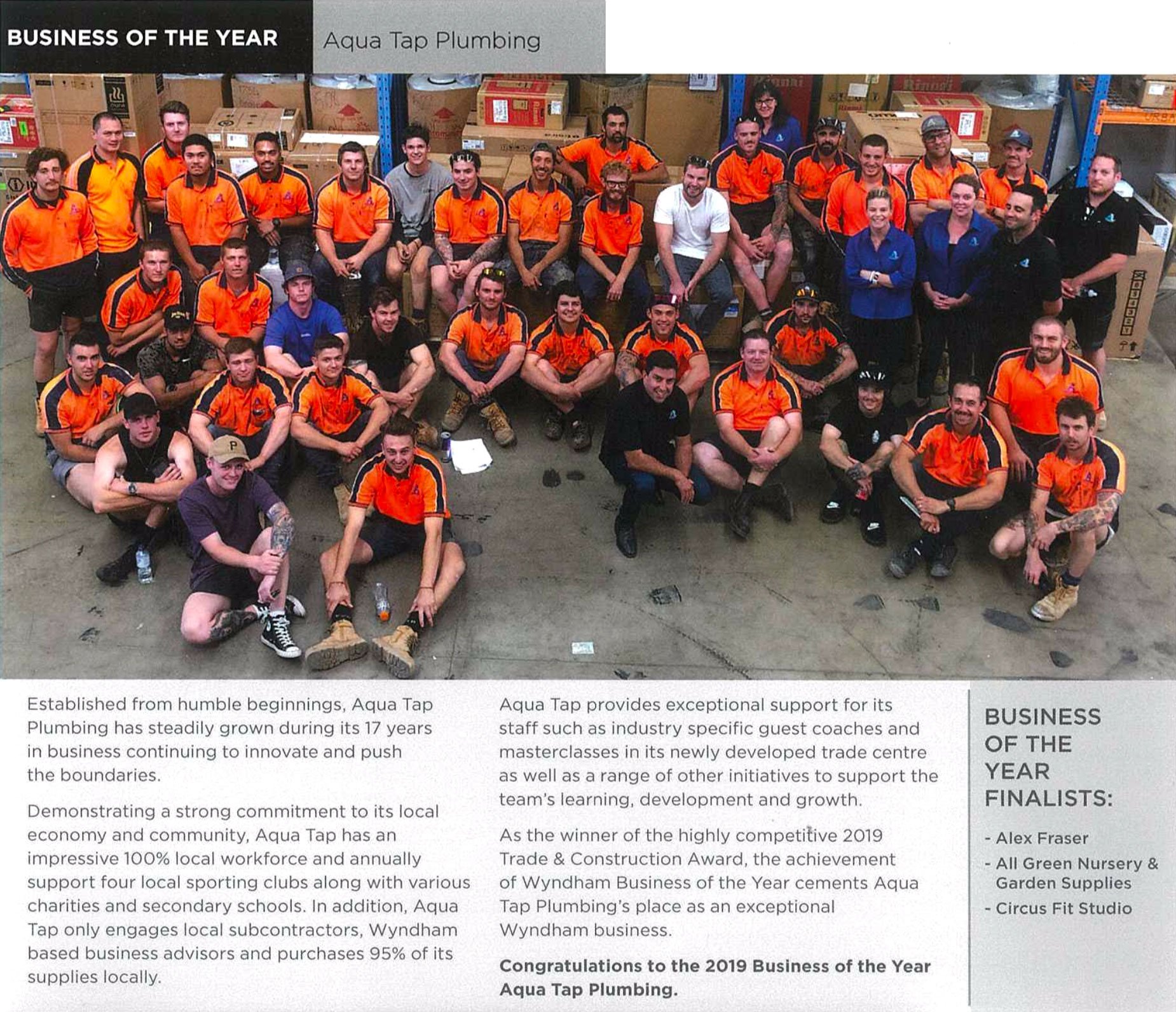 Finally, the management team at Aqua Tap Plumbing would like to thank all its staff, customers, family, friends and the city of Wyndham for their continued support and for the role they each played in helping us to be named ‘2019 Business of the Year’.